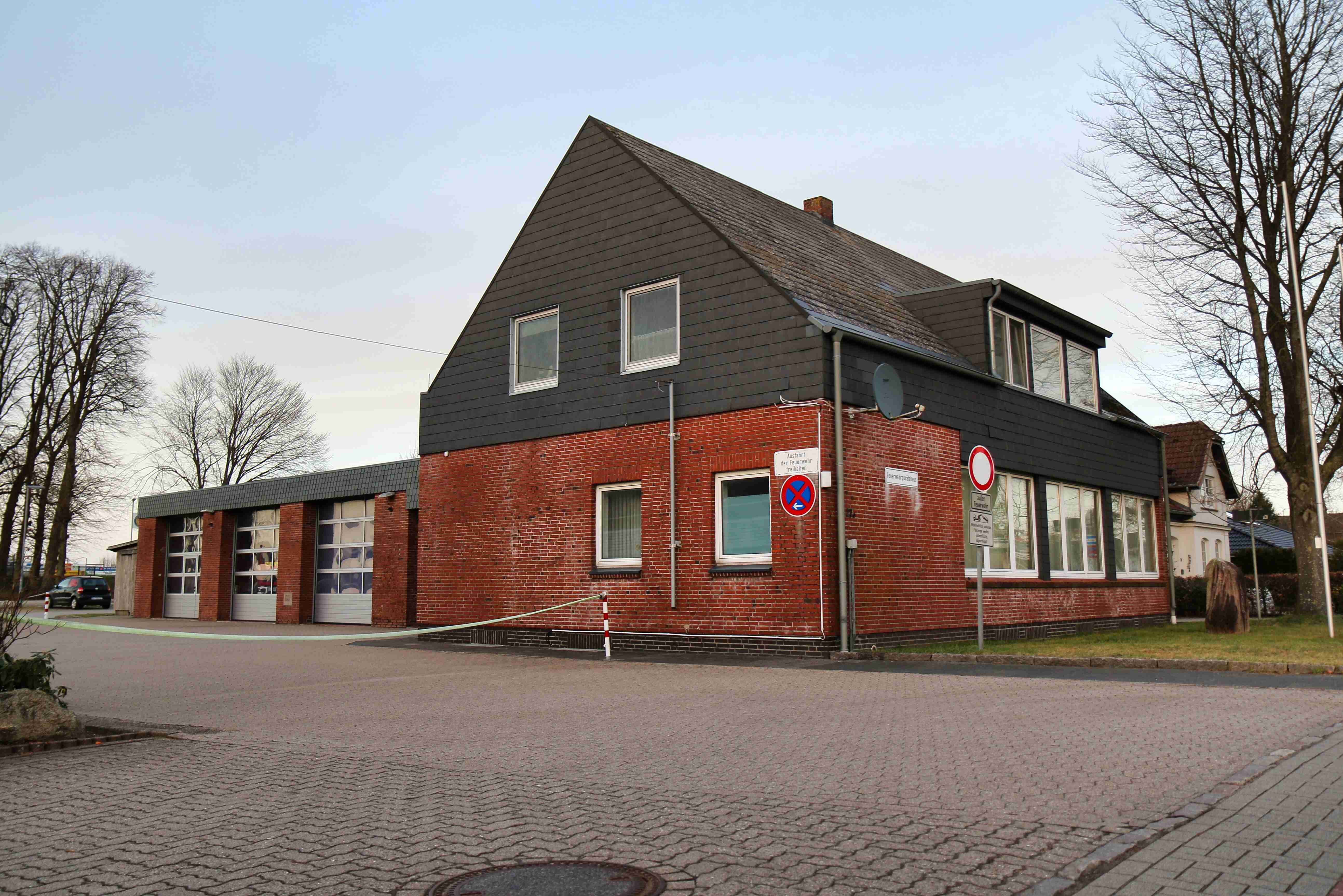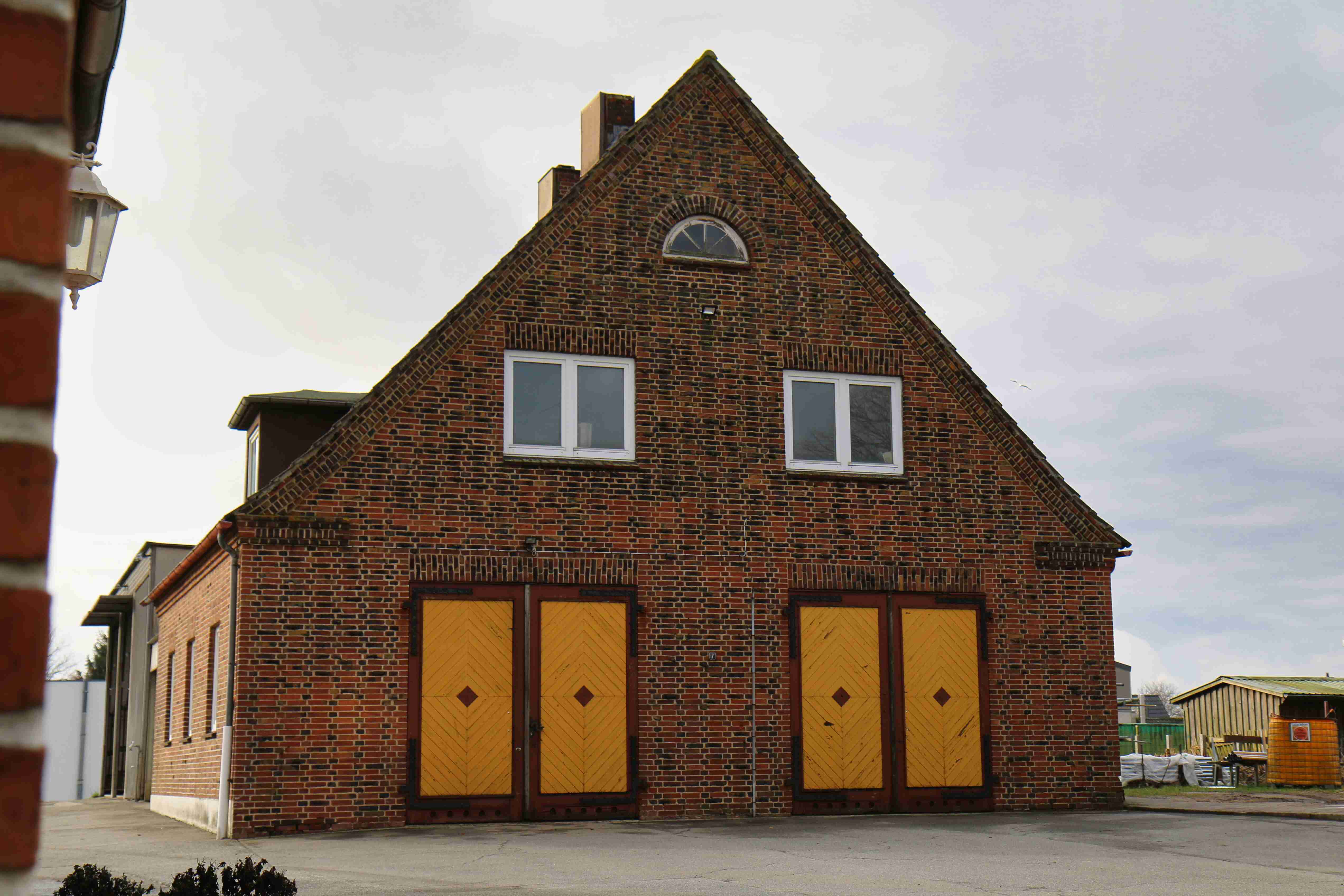 Das Gebäude wird uns in den nächsten Jahren als Provisorium dienen, bis unser neues Gerätehaus in der Kappelner Straße bezugsfähig ist. Drei Stellplätze sowie Platz für unsere Schutzkleidung stehen uns neben santären Anlagen und einem Arbeitsbereich für unsere Gerätewarte zur Verfügung.